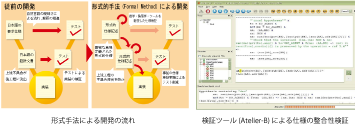 近年のソフトウェア信頼性への要求の高まりに伴い、 数理的技法に基づき仕様定義や設計を行う「形式手法」が注目されています。 当場と北海道の中小企業を中心として組織された研究コンソーシアムでは、 要求定義~設計~実装までの過程の正しさを数理的に証明出来る形式手法「Bメソッド」による 高信頼ソフトウェア開発技術の技術導入に関して、実践的な取り組みを進めています。