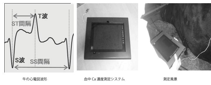 北海道では出産する乳牛が年間50万頭いますが、そのうち約4万頭が分娩前後に起立不能となり、 約4,000頭が死亡しています。これら起立不能の約6割が低カルシウム(Ca)血症が原因で、 血中Ca濃度の測定により早期に診断し、カルシウム剤の投与など適切な対処をする必要があります。 しかし、血液検査は時間がかかるため、実際には獣医師が臨床症状のみから診断をしており、 不必要な投薬や対処の遅れが生じています。 そこで本研究では、牛の血中Ca濃度の低下によって心電図のST波形が伸張することを利用し、 畜産試験場と共同で心電計による血中Ca濃度簡易計測技術の開発に取り組みました。