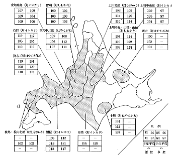 北海道の上川、留萌、網走、十勝、空知、石狩、後志、胆振、日高の各支庁管内および渡島、桧山の北部。