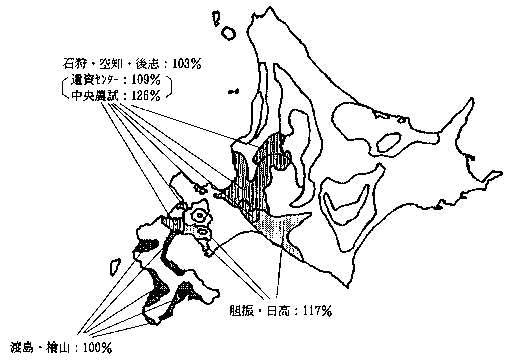 (下図の網掛け部分、「道産豆類地帯別栽培指針」(平成6年3月北海道農政部)の小豆栽培地帯区分による、数字は各地帯における規格内子実重の「アカネダイナゴン」対比)