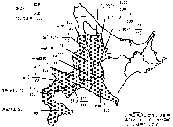 1)栽培地帯 上川(風連以南)、留萌(中南部)、空知、石狩、後志、日高、胆振、渡島および檜山各支庁管内
