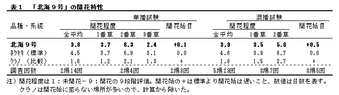 1)早晩性 :開花始日はホクセキ並であり、早生に属する。ホクセキに比べ2番草の開花程度がやや小さい。クラノより開花程度は大きい(表1)。