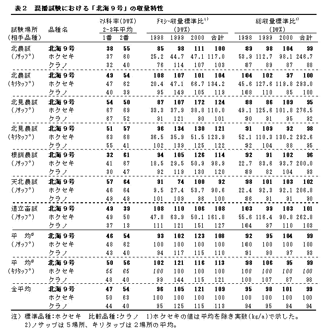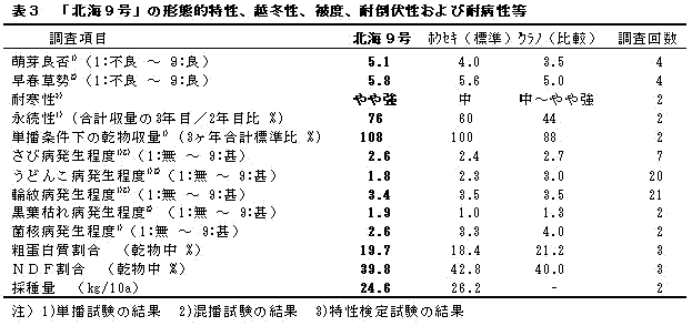 2)育成経過 1980年に3600個体の2倍体基礎集団を養成し、2サイクルの個体選抜を経て、「サッポロ」よりやや晩生で、越冬性、永続性および採種性に優れる10母系を選抜した。1992年より北農試と根釧農試においてこの10母系の生産力を検定し、2番草の生育が比較的穏やかな4母系について北農試で菌核病菌を接種し、スクリーニングした残存株を組み合わせて育成した。1998年より「北海9号」として地域適応性検定試験ならびに各種特性検定試験を実施した。