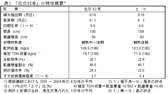 (1) 草地酪農地帯である北海道の根釧地域において飼料自給率の向上を図るためには、雌穂割合の高いトウモロコシの栽培拡大が不可欠である。この地域に適する“早生の早”の唯一の優良品種である「エマ」は既に種子供給が停止し、それに代わる優良品種が早急に必要となっている。「北交62号」は、根釧地域において黄熟期刈りの可能な早熟性や初期生育性、重要病害であるすす紋病に対する抵抗性および収量性に関して「エマ」を上回る能力を備えており、低温年の2003年にも安定して多収であった。また、耐倒伏性も「エマ」並に優れている。本品種の普及により根釧地域における良質自給飼料生産の拡大に貢献できる。