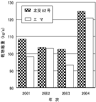 (2) 乾物総重および推定TDN収量は、それぞれ「エマ」より6%および9%高い。乾雌穂重割合は「エマ」より約9%高い(表1、図1、2)。