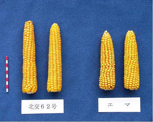 写真2 「北交62号」と「エマ」の雌穂(撮影:2004年3月20日、北農研)