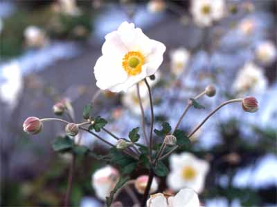 漢字で「秋明菊」と書くが実は中国原産のキンポウゲの仲間。茶花としても用いられ、切り花に適している。肥沃でやや湿気の多い土壌を好む。 |