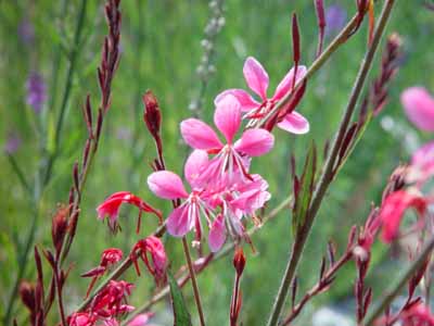 品目名 ハクチョウソウ 品種名 ピンク 学 名 Gaura lindheimeri 科 名 アカバナ科 分 類 宿根草 草 丈 100㎝ 草 姿 立ち性 花 色 ピンク 開花期間 2ヶ月以上 特 性 北アメリカ原産で「ガウラ」と呼ばれる。また漢字では「白蝶草」と書く。生育は強健で開花期間も長い。日の当たる花壇で栽培する。 4月 5月 6月 7月 8月 9月 10月 △ ・ ・ ・ ◎ △:萌芽期、■:開花期間、◎:最盛期